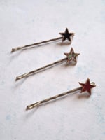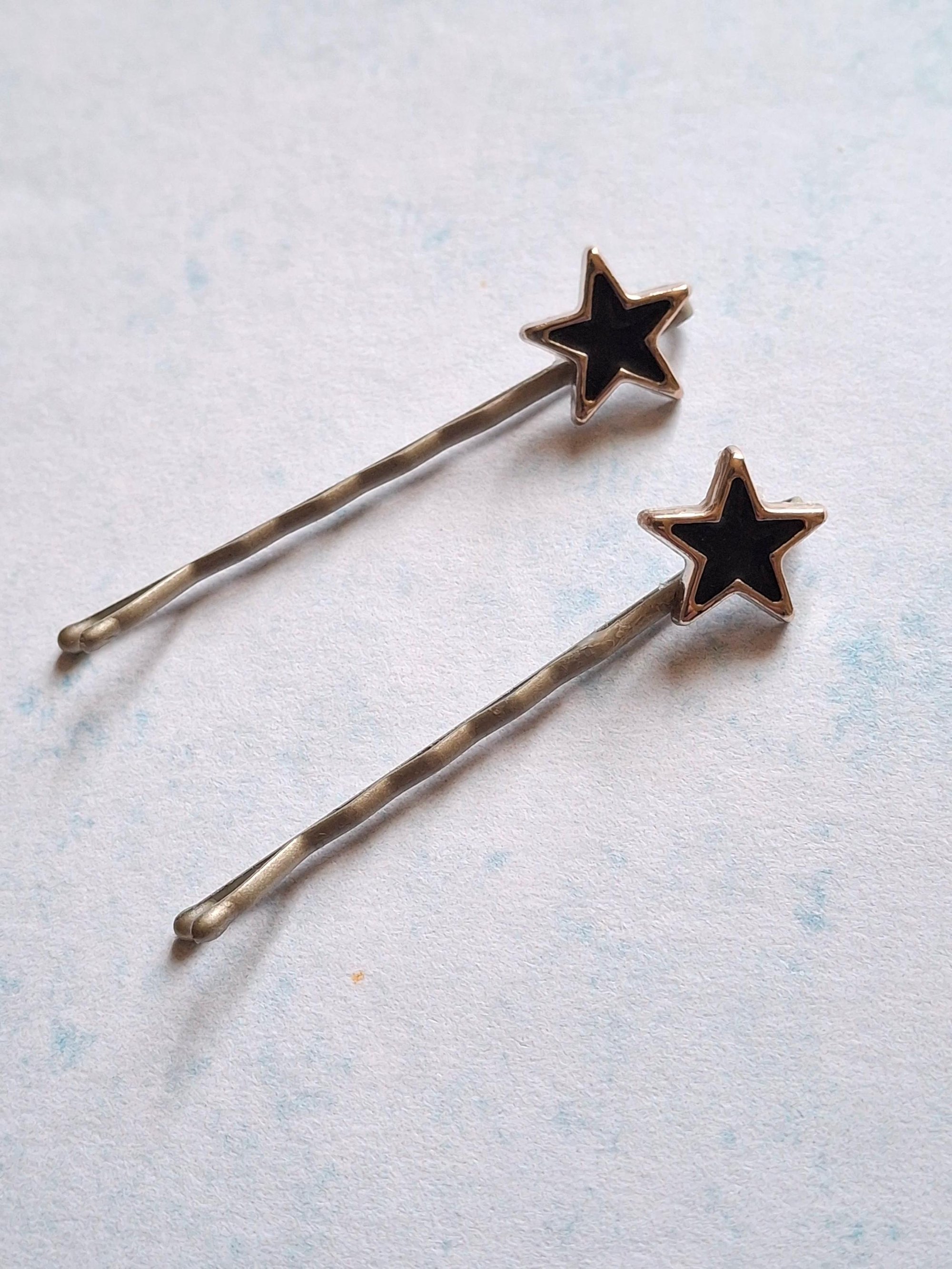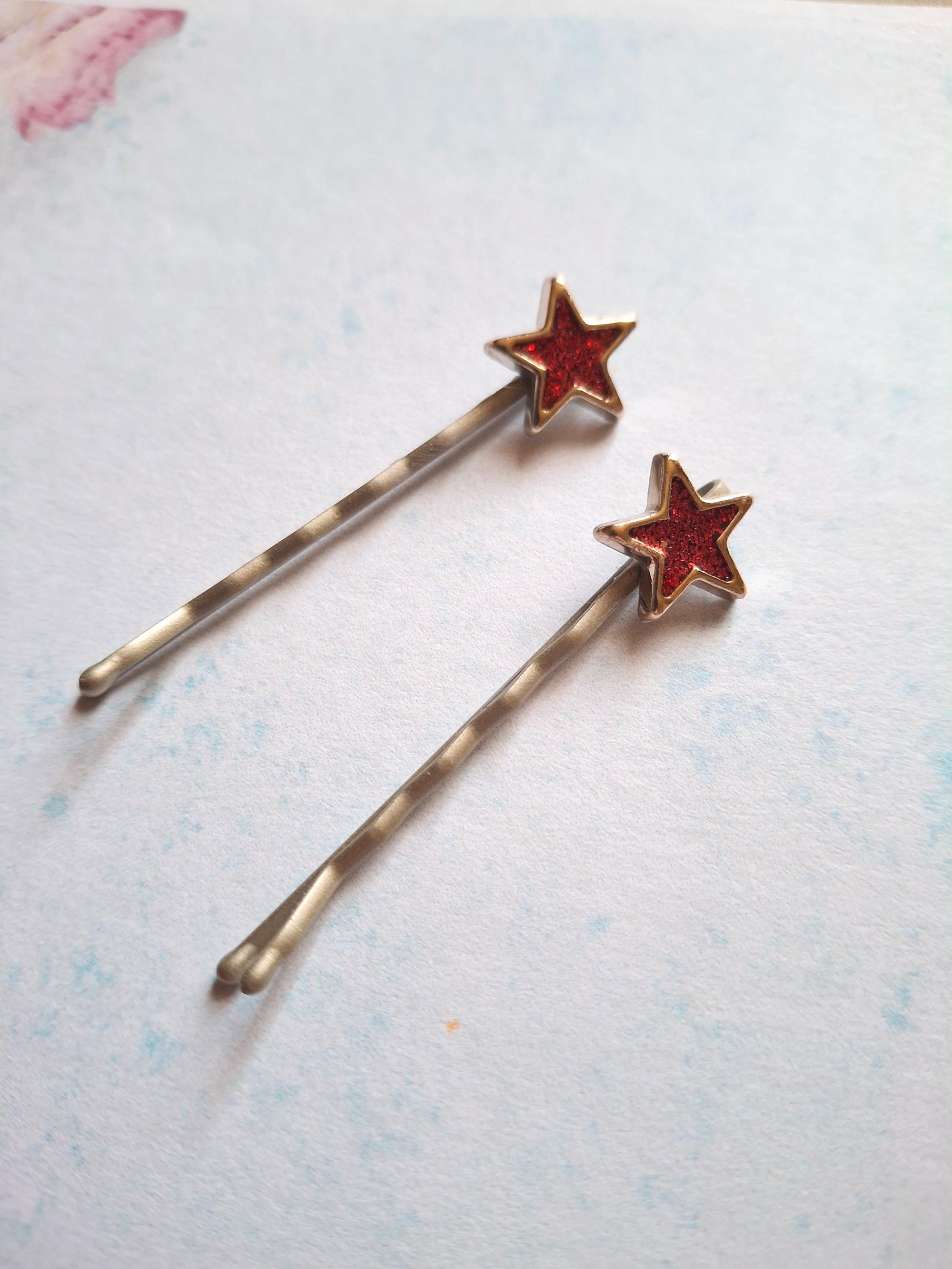 Add a touch of celestial charm to your hair with this set of 6 starry bobby pins! The set includes 2 red, 2 black, and 2 white pins, each adorned with a cute little star. These versatile bobby pins are perfect for adding a pop of color and whimsy to any hairstyle, whether you're rocking a messy bun or a sleek updo. Made with durable materials, these pins are built to last and will keep your hair secure all day long. A must-have accessory for any starry-eyed fashionista!