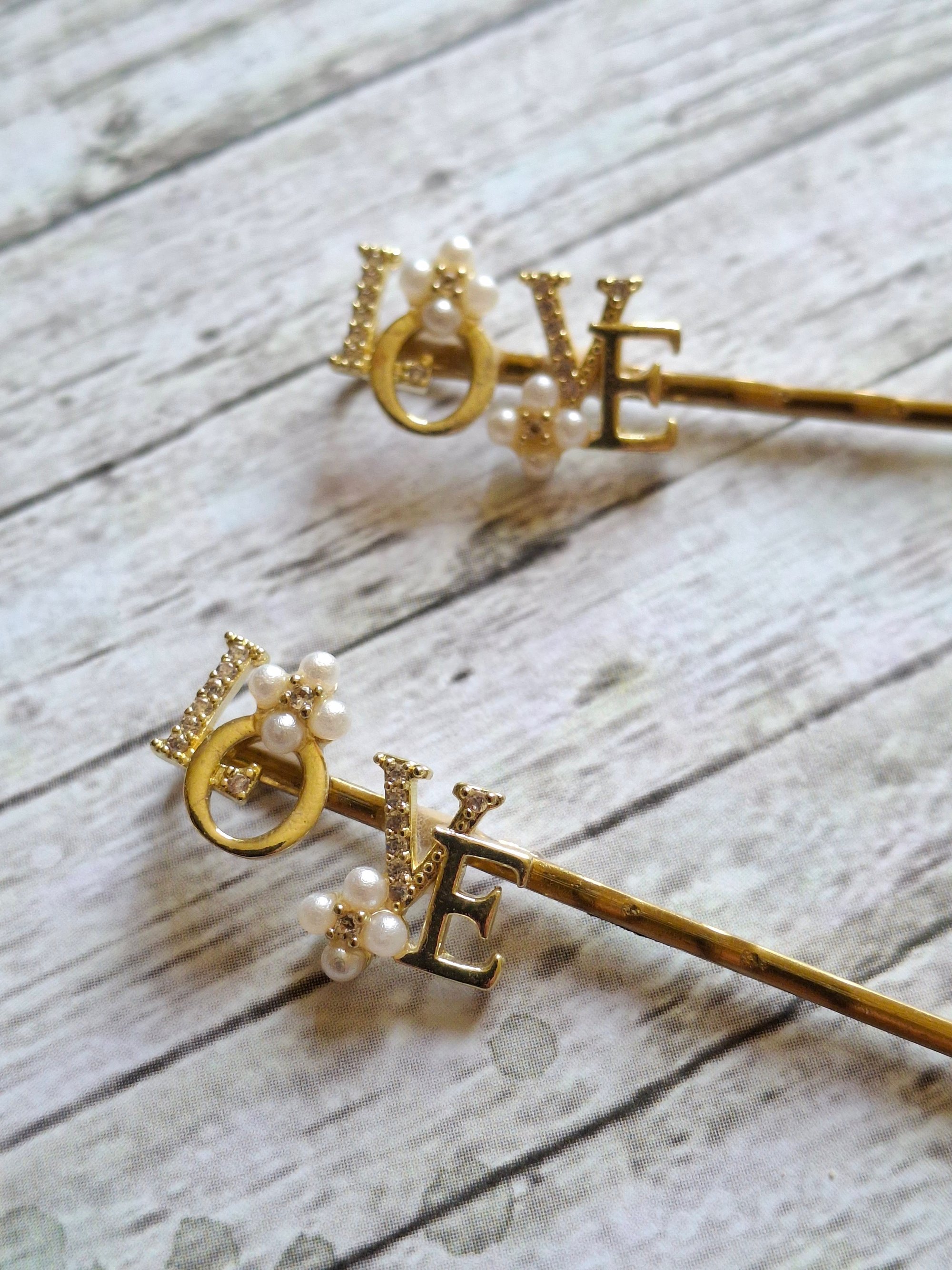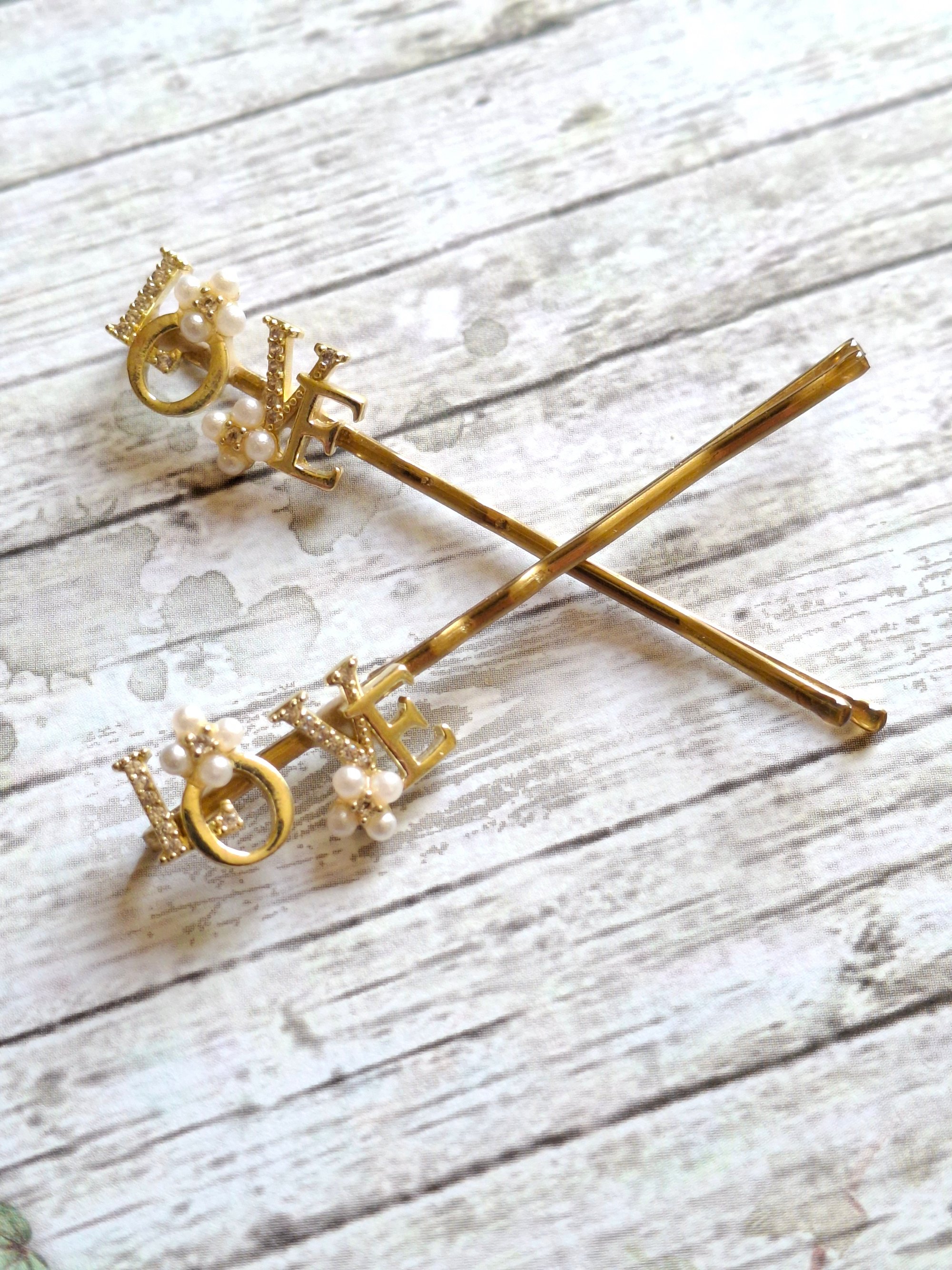 Add a whisper of romance to your hairstyle with this delicate duo. Each 2-inch gold-toned bobby pin features the word LOVE adorned in luminous faux pearls, bringing a sweet yet sophisticated touch to any look. Perfect for boho brides, everyday dreamers, or anyone channeling effortless charm. Wear them together or apart for an enchanting finish that's as unique as you are.