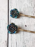 This beautiful set of handmade bobby pins is adorned with metallic-colored flowers, giving them an elegant and sophisticated touch. This set of four bobby pins is perfect for any special event, from weddings to formal dinners, and they are an impressive addition to any hairstyle.