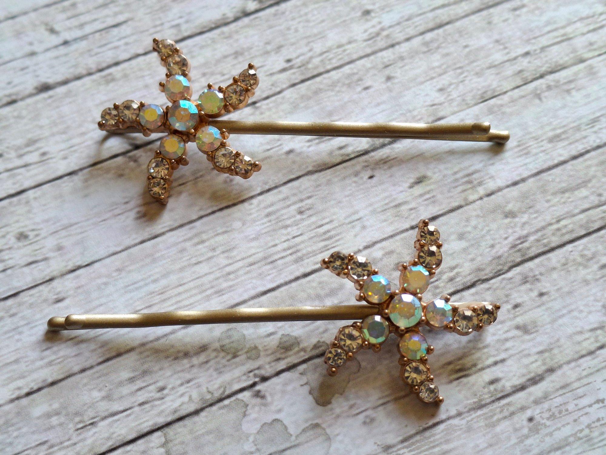 Catch the light and a few compliments with these gold-toned bobby pins, each topped with a star-shaped shimmer of iridescent blooms. Handmade with love and perfect for adding that magical finishing touch—whether it’s a special event or just a little everyday sparkle.